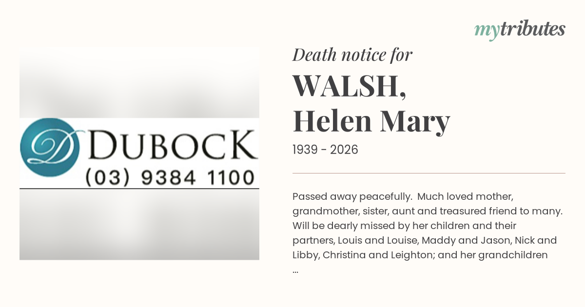 15°CPassed away peacefully. Much loved mother, grandmother, sister, aunt and treasured friend to many. Will be dearly missed by her children and their partners, Louis and Louise, Maddy and Jason, Nick and Libby, Christina and Leighton; and her grandchildren Caitlin, Benjamin, Elena, Saskia, Francesca, Raphael, Theodora and Leopold.