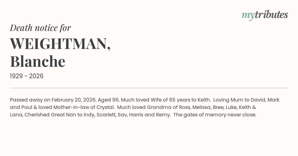 Much loved Grandma of Ross, Melissa, Bree, Luke, Keith & Lana,