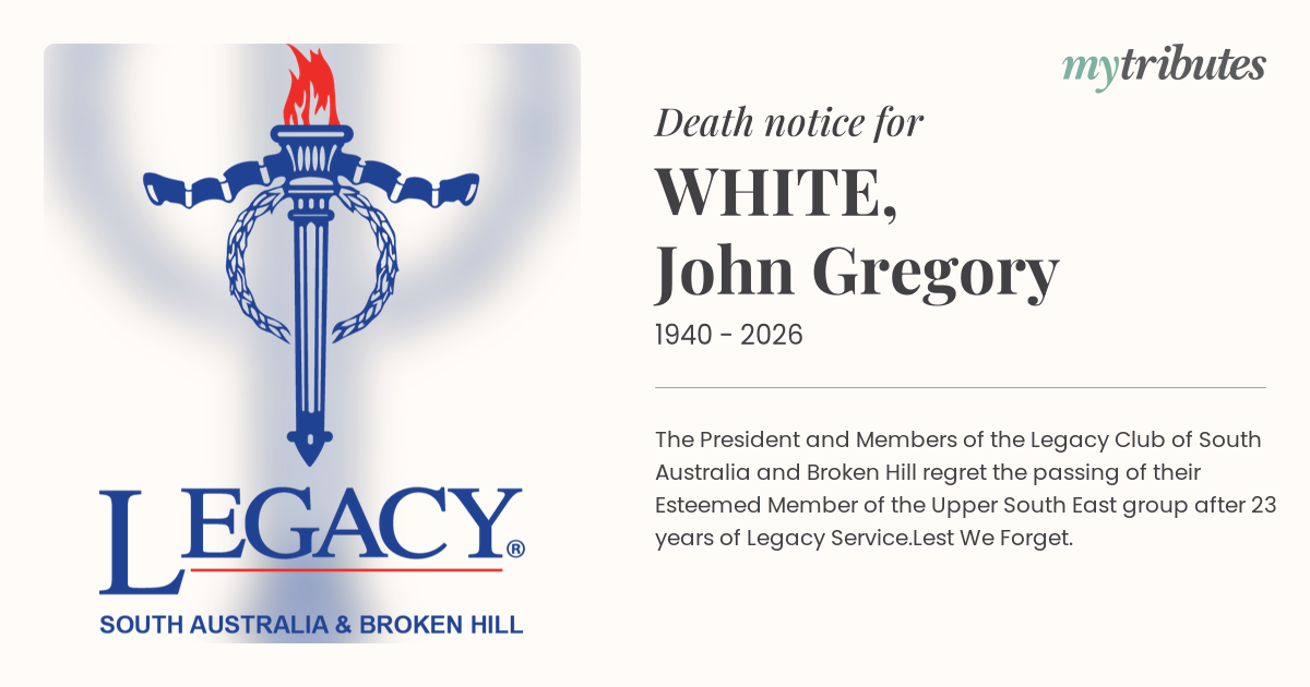 15°CThe President and Members of the Legacy Club of South Australia and Broken Hill regret the passing of their Esteemed Member of the Upper South East group after 23 years of Legacy Service.
