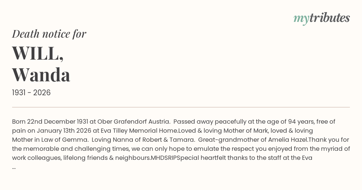 15°CBorn 22nd December 1931 at Ober Grafendorf Austria. Passed away peacefully at the age of 94 years, free of pain on January 13th 2026 at Eva Tilley Memorial Home.