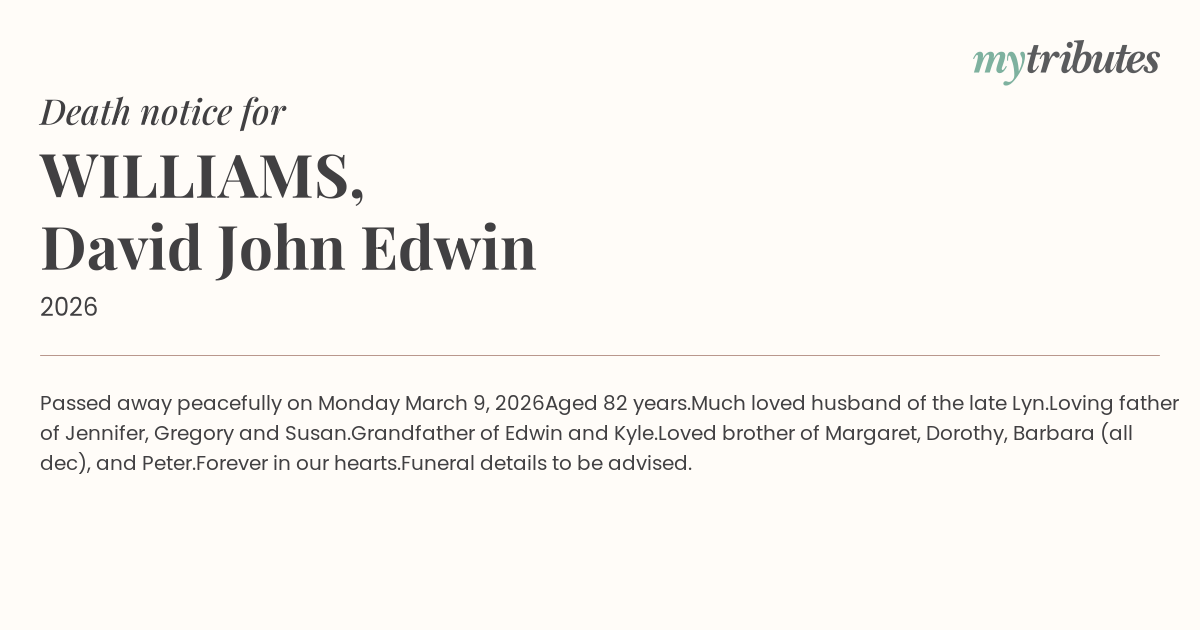 15°CPassed away peacefully on Monday March 9, 2026