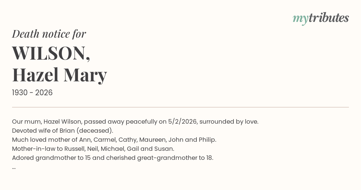15°COur mum, Hazel Wilson, passed away peacefully on 5/2/2026, surrounded by love.