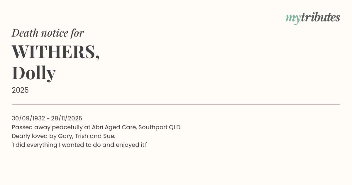 Passed away peacefully at Abri Aged Care, Southport QLD.