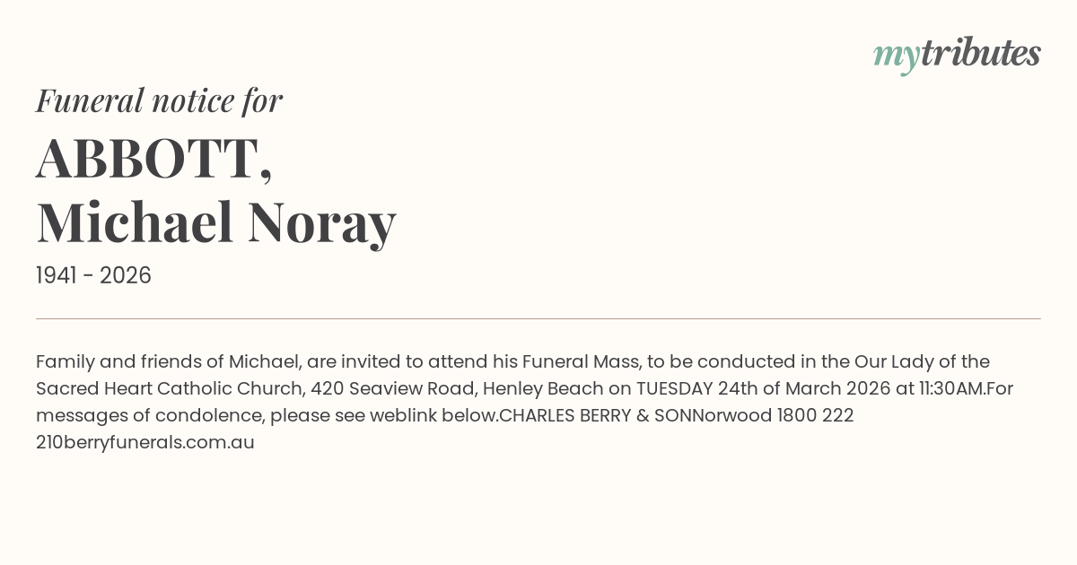 15°CFamily and friends of Michael, are invited to attend his Funeral Mass, to be conducted in the Our Lady of the Sacred Heart Catholic Church, 420 Seaview Road, Henley Beach on TUESDAY 24th of March 2026 at 11:30AM.