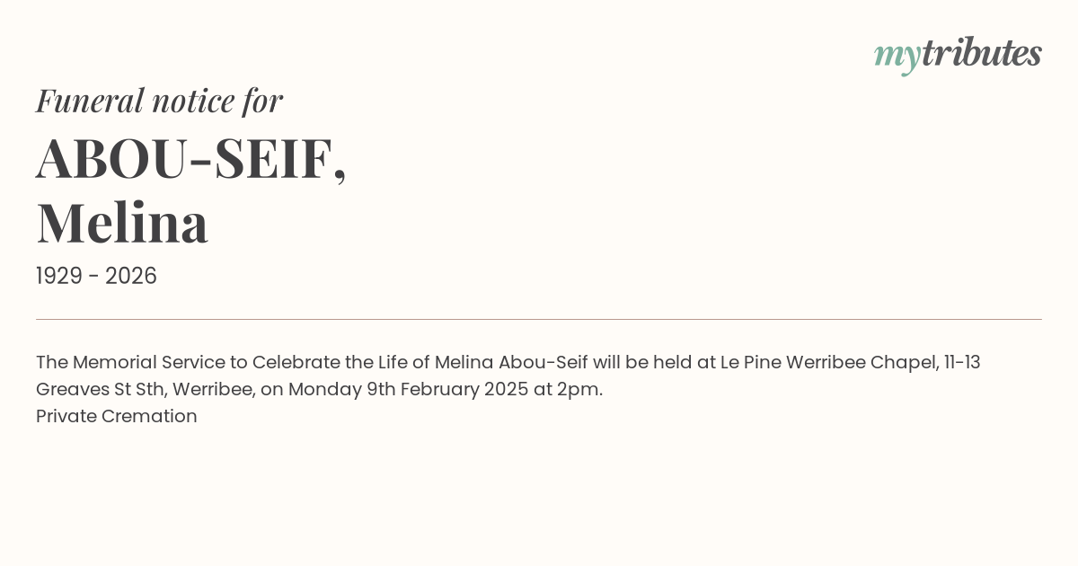 15°CThe Memorial Service to Celebrate the Life of Melina Abou-Seif will be held at Le Pine Werribee Chapel, 11-13 Greaves St Sth, Werribee, on Monday 9th February 2025 at 2pm.