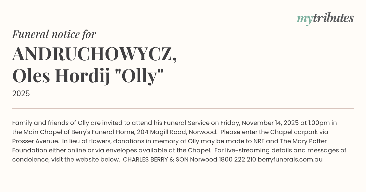 15°CFamily and friends of Olly are invited to attend his Funeral Service on Friday, November 14, 2025 at 1:00pm in the Main Chapel of Berry's Funeral Home, 204 Magill Road, Norwood.