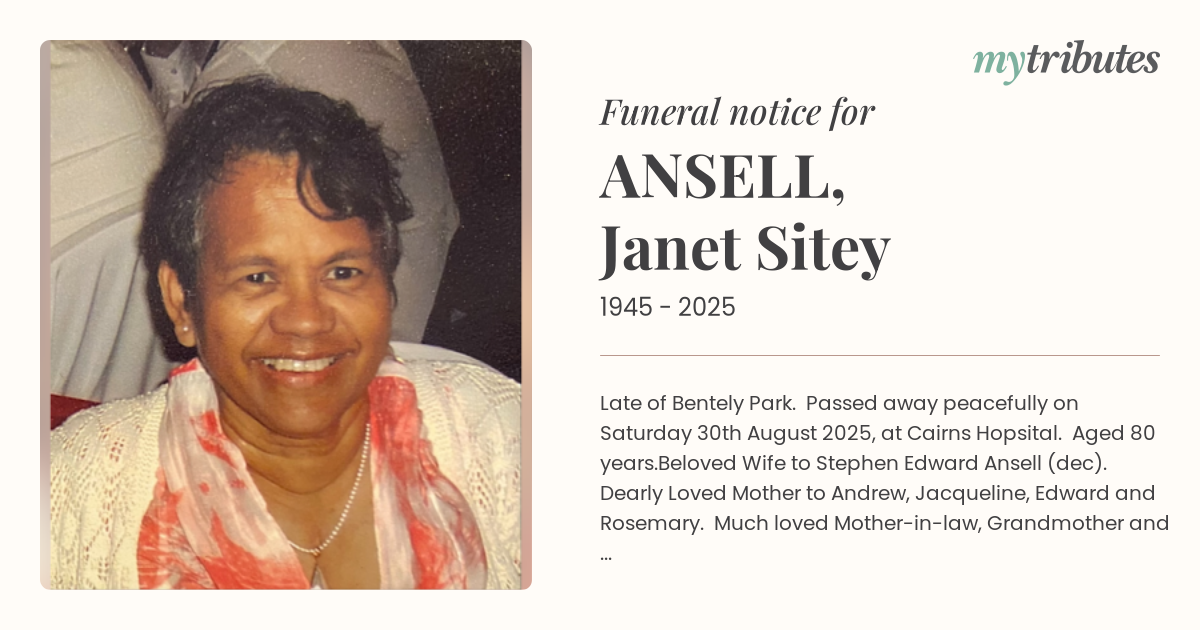All Family and Friends respectfully invited to attend Janet's Funeral Service which will be held at the Cairns Funeral Directors Chapel, 36 Pease Street, Manoora on Friday 12th September 2025. Viewing will be from 9-10AM, followed by the Church service from 10AM.