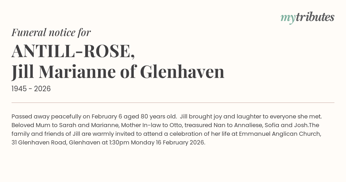 The family and friends of Jill are warmly invited to attend a celebration of her life at Emmanuel Anglican Church, 31 Glenhaven Road, Glenhaven at 1:30pm Monday 16 February 2026.