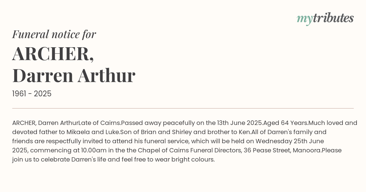 All of Darren's family and friends are respectfully invited to attend his funeral service, which will be held on Wednesday 25th June 2025, commencing at 10.00am in the the Chapel of Cairns Funeral Directors, 36 Pease Street, Manoora.
