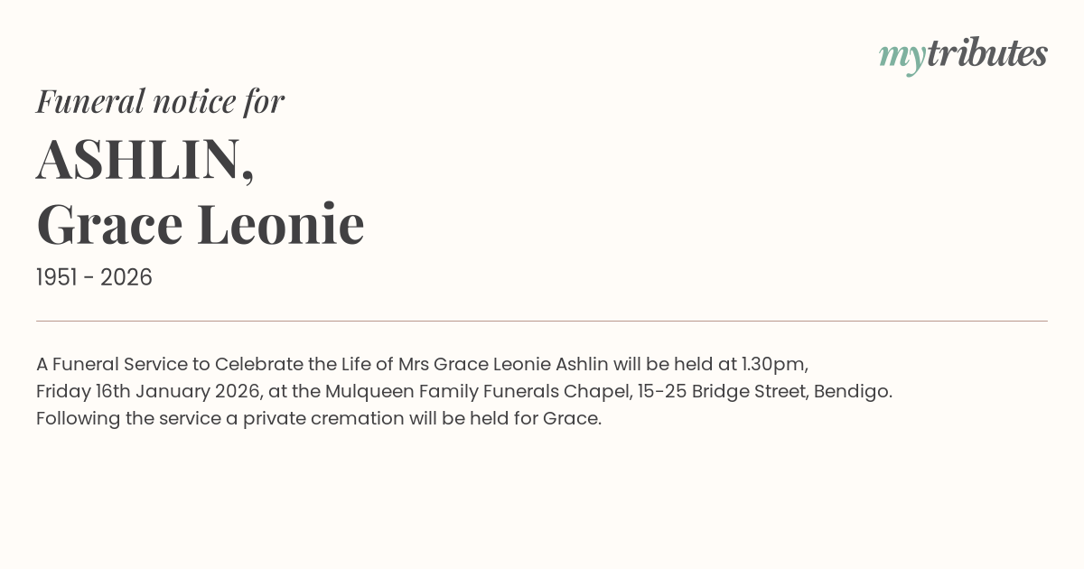 15°CA Funeral Service to Celebrate the Life of Mrs Grace Leonie Ashlin will be held at 1.30pm,