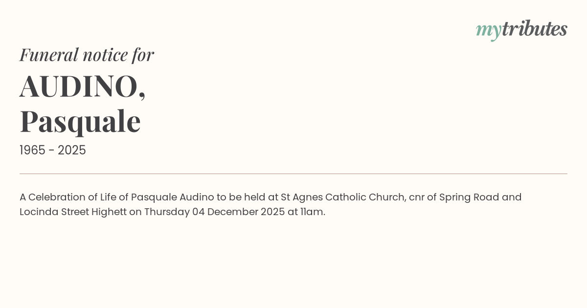 15°CA Celebration of Life of Pasquale Audino to be held at St Agnes Catholic Church, cnr of Spring Road and Locinda Street Highett on Thursday 04 December 2025 at 11am.