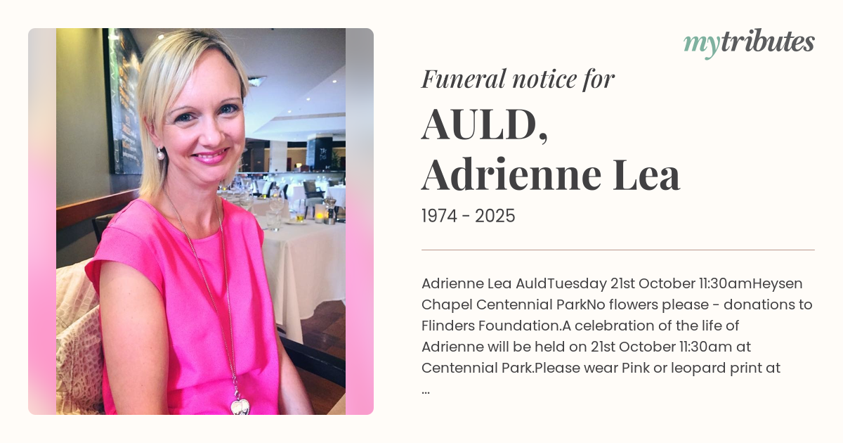 A celebration of the life of Adrienne will be held on 21st October 11:30am at Centennial Park.