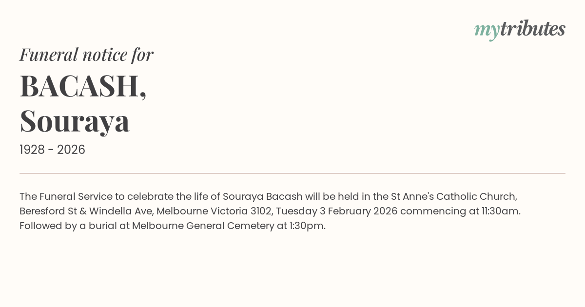 15°CThe Funeral Service to celebrate the life of Souraya Bacash will be held in the St Anne's Catholic Church, Beresford St & Windella Ave, Melbourne Victoria 3102, Tuesday 3 February 2026 commencing at 11:30am.