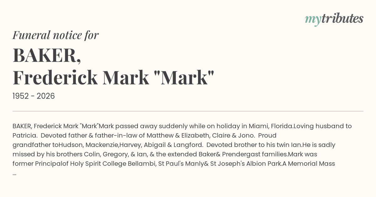 A Memorial Mass for Mark will be held at St Patrick's Catholic Church, 136 Flora Street Sutherland on