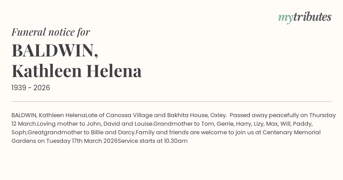 Family and friends are welcome to join us at Centenary Memorial Gardens on Tuesday 17th March 2026