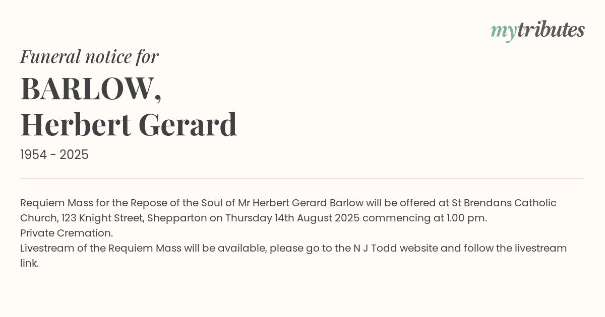 15°CRequiem Mass for the Repose of the Soul of Mr Herbert Gerard Barlow will be offered at St Brendan’s Catholic Church, 123 Knight Street, Shepparton on Thursday 14th August 2025 commencing at 1.00 pm.