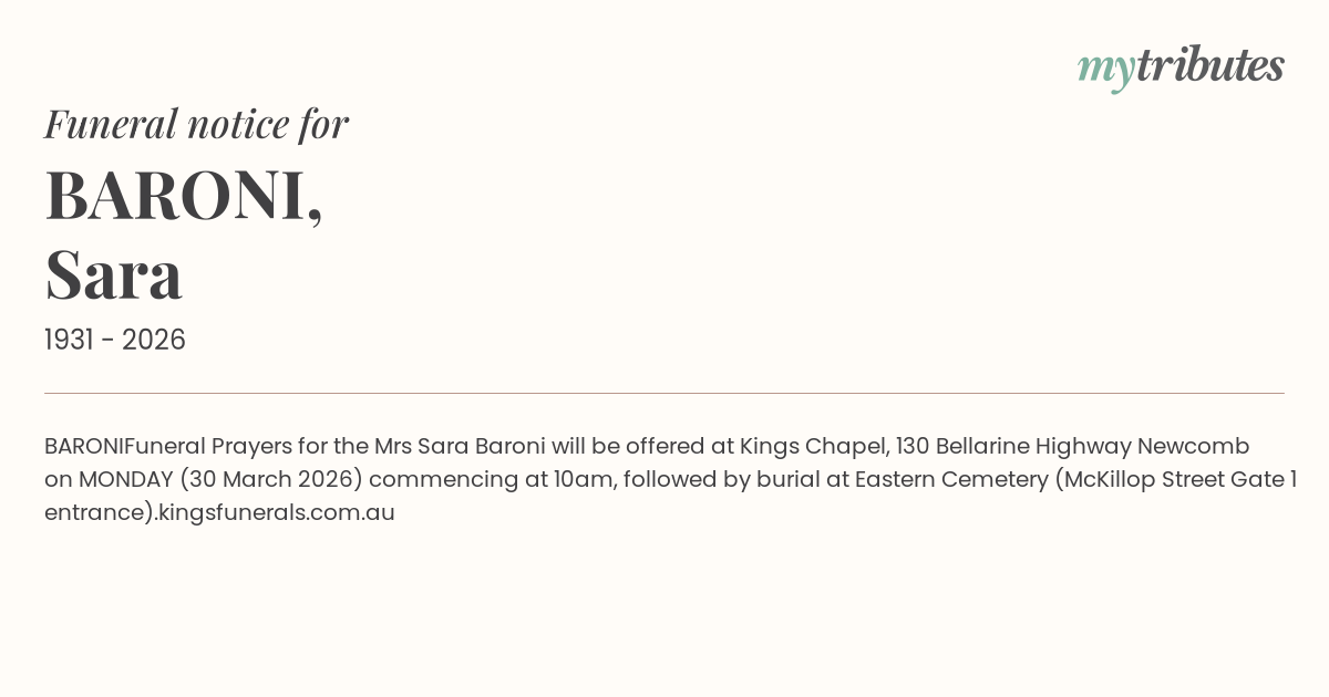 Funeral Prayers for the Mrs Sara Baroni will be offered at Kings Chapel, 130 Bellarine Highway Newcomb on MONDAY (30 March 2026) commencing at 10am, followed by burial at Eastern Cemetery (McKillop Street Gate 1 entrance).