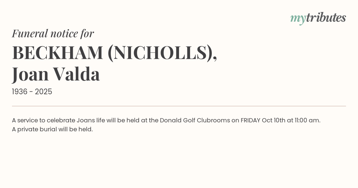 15°CA service to celebrate Joan’s life will be held at the Donald Golf Clubrooms on FRIDAY Oct 10th at 11:00 am.