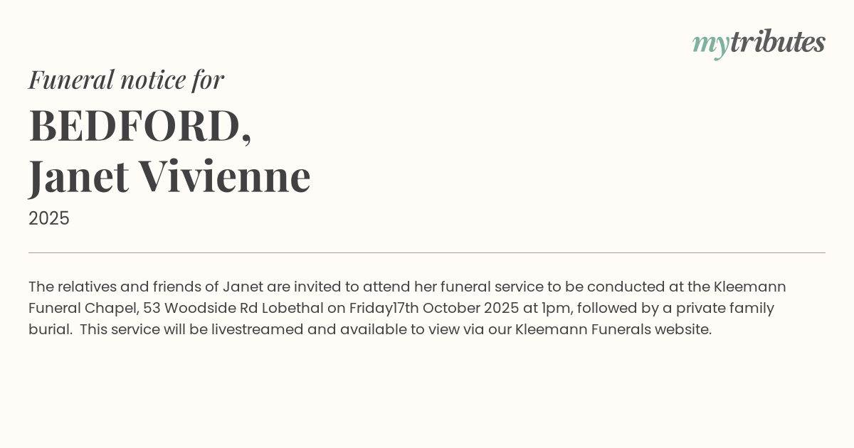 15°CThe relatives and friends of Janet are invited to attend her funeral service to be conducted at the Kleemann Funeral Chapel, 53 Woodside Rd Lobethal on Friday17th October 2025 at 1pm, followed by a private family burial. This service will be livestreamed and available to view via our Kleemann Funerals website.