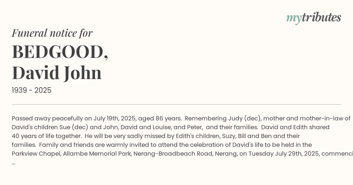 Family and friends are warmly invited to attend the celebration of David's life to be held in the Parkview Chapel, Allambe Memorial Park, Nerang-Broadbeach Road, Nerang, on Tuesday July 29th, 2025, commencing at 11am.