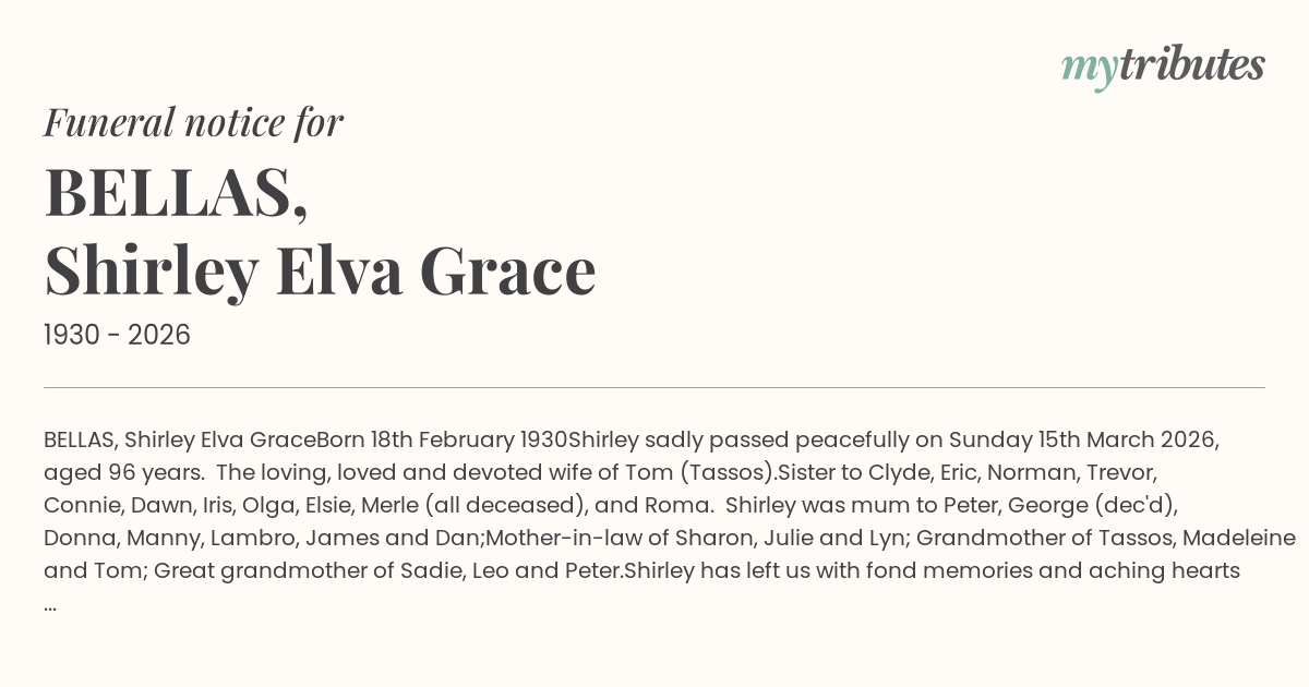 Relatives and friends are invited to attend Shirley's service to be held 9.30am 31st March 2026 at Mount Gravatt Cemetery Chapel, Mains Rd, Nathan.