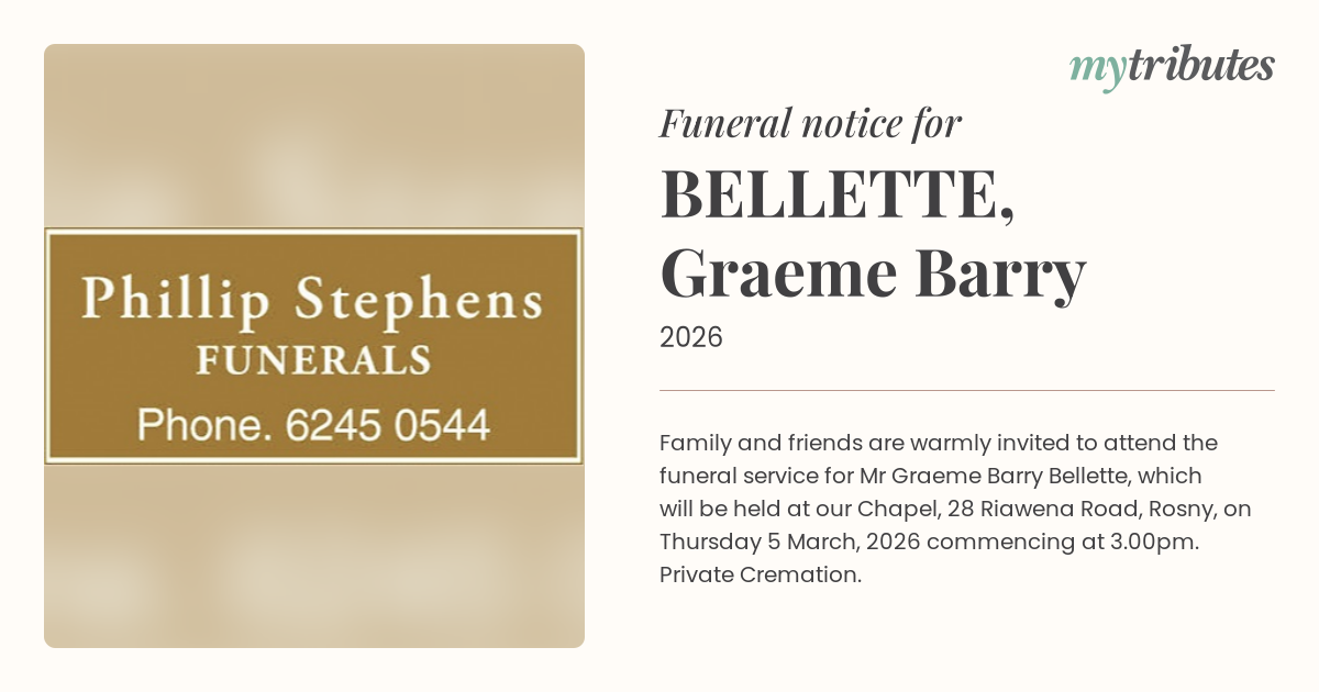15°CFamily and friends are warmly invited to attend the funeral service for Mr Graeme Barry Bellette, which will be held at our Chapel, 28 Riawena Road, Rosny, on Thursday 5 March, 2026 commencing at 3.00pm.