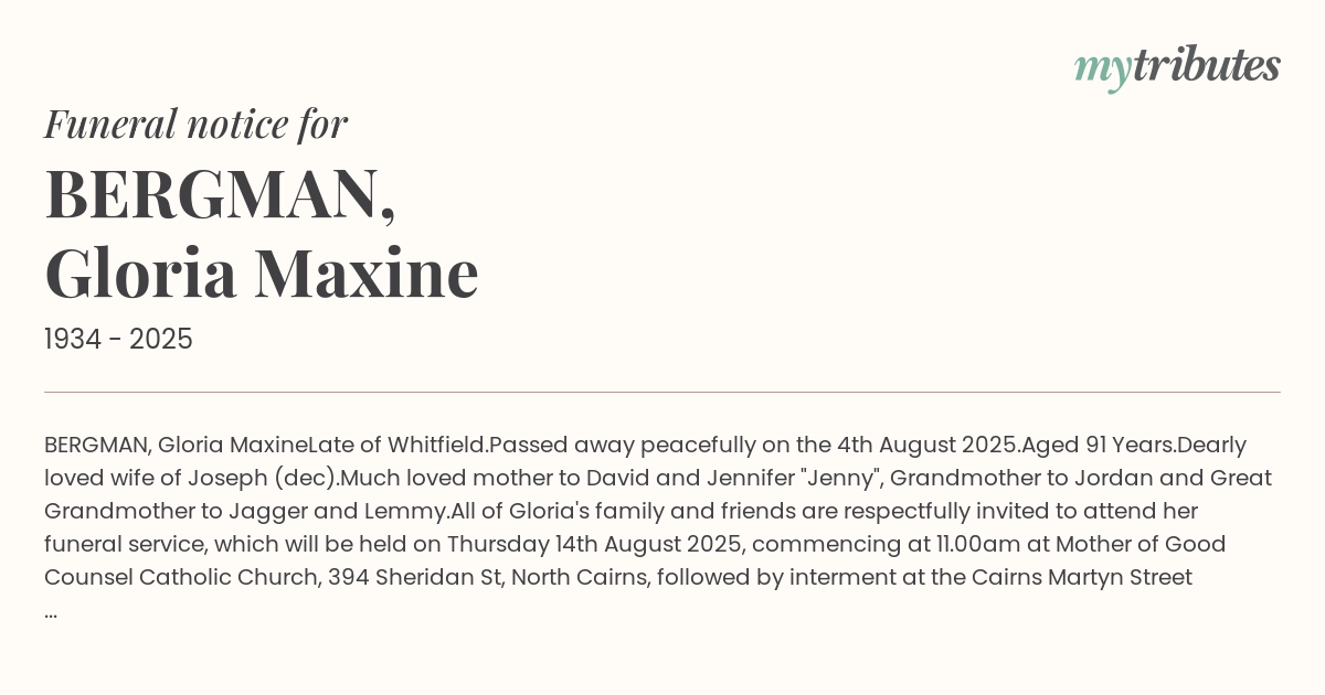 All of Gloria's family and friends are respectfully invited to attend her funeral service, which will be held on Thursday 14th August 2025, commencing at 11.00am at Mother of Good Counsel Catholic Church, 394 Sheridan St, North Cairns, followed by interment at the Cairns Martyn Street Cemetery.