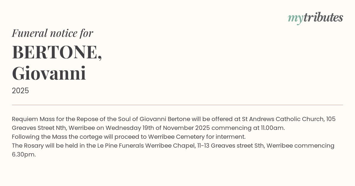 15°CRequiem Mass for the Repose of the Soul of Giovanni Bertone will be offered at St Andrews Catholic Church, 105 Greaves Street Nth, Werribee on Wednesday 19th of November 2025 commencing at 11.00am.