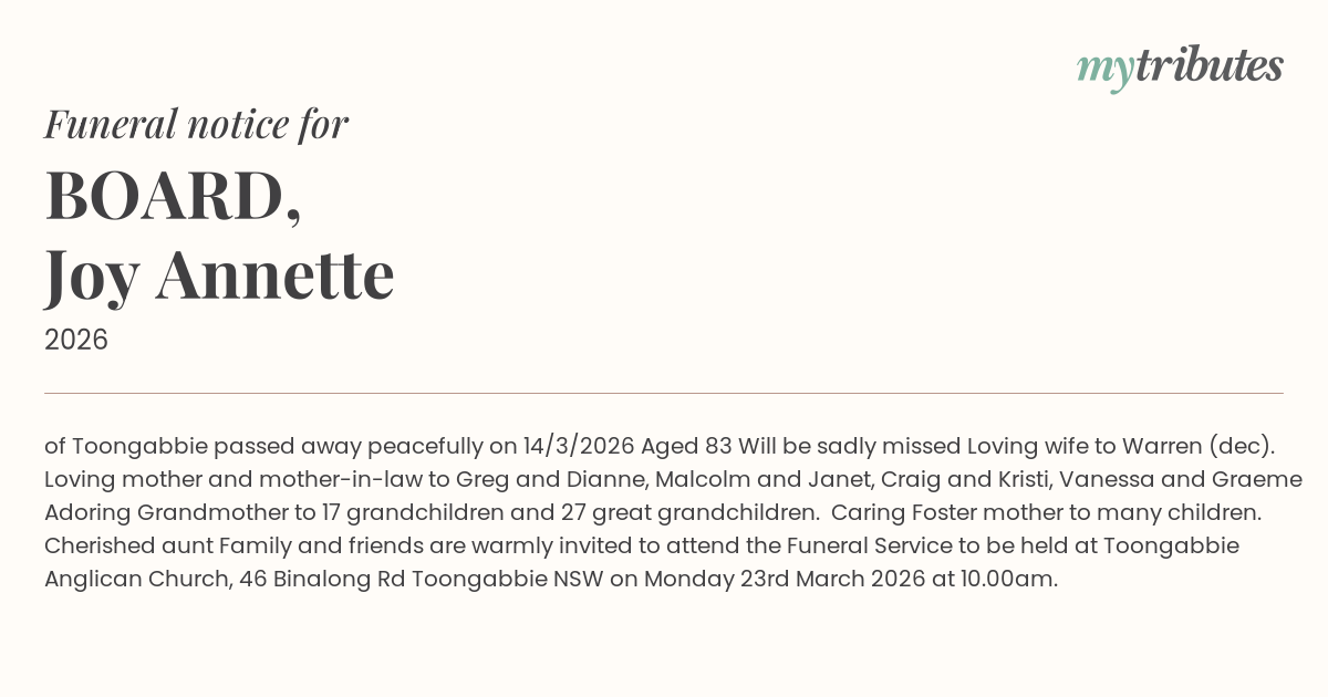 Family and friends are warmly invited to attend the Funeral Service to be held at Toongabbie Anglican Church, 46 Binalong Rd Toongabbie NSW on Monday 23rd March 2026 at 10.00am.