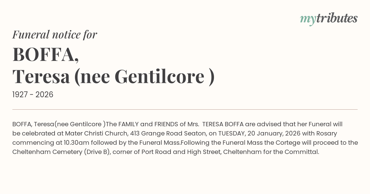 The FAMILY and FRIENDS of Mrs. TERESA BOFFA are advised that her Funeral will be celebrated at Mater Christi Church, 413 Grange Road Seaton, on TUESDAY, 20 January, 2026 with Rosary commencing at 10.30am followed by the Funeral Mass.