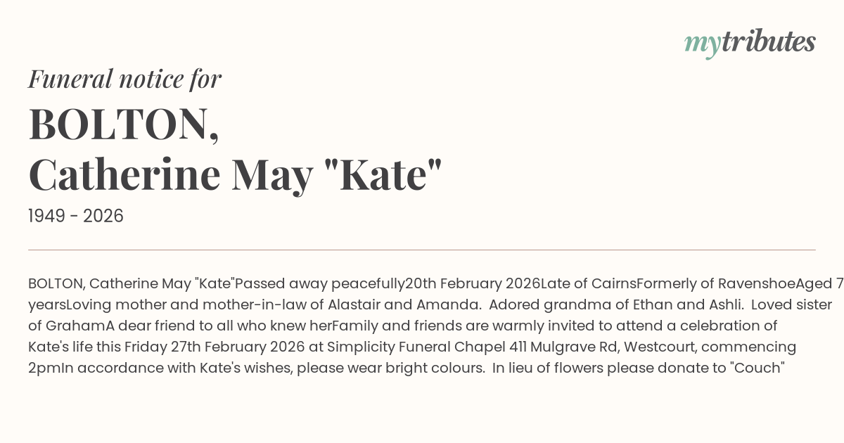 Family and friends are warmly invited to attend a celebration of Kate's life this Friday 27th February 2026 at Simplicity Funeral Chapel 411 Mulgrave Rd, Westcourt, commencing 2pm