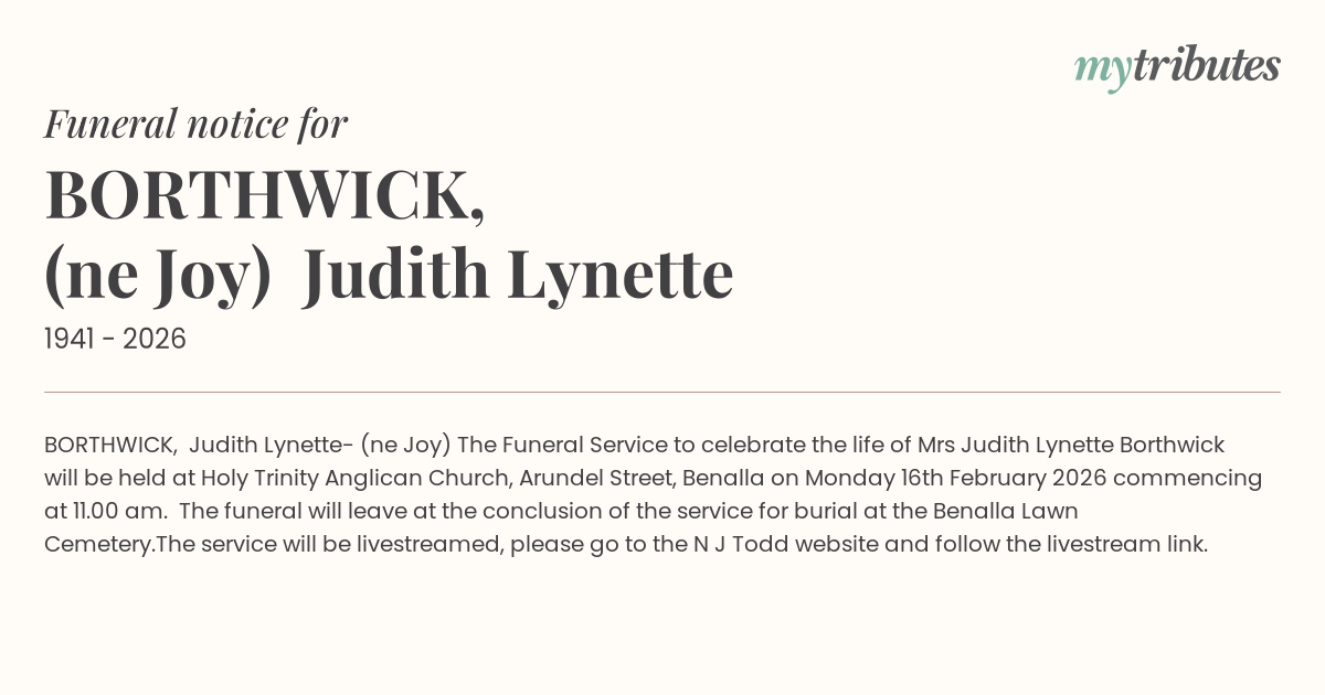 The Funeral Service to celebrate the life of Mrs Judith Lynette Borthwick will be held at Holy Trinity Anglican Church, Arundel Street, Benalla on Monday 16th February 2026 commencing at 11.00 am. The funeral will leave at the conclusion of the service for burial at the Benalla Lawn Cemetery.