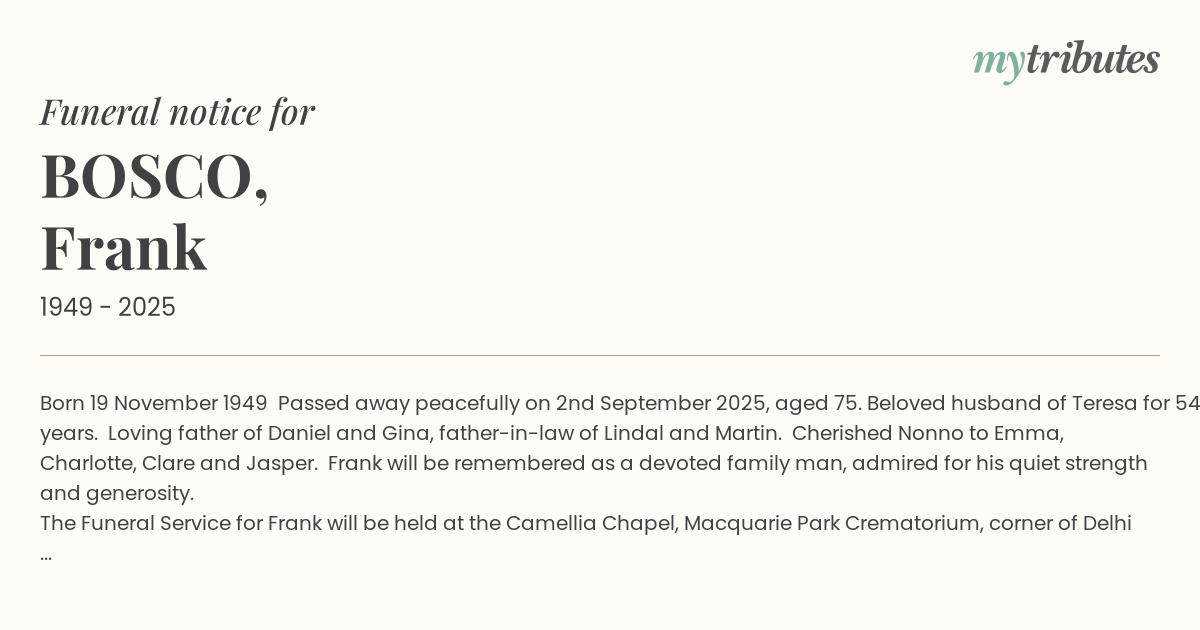15°CBorn 19 November 1949 – Passed away peacefully on 2nd September 2025, aged 75. Beloved husband of Teresa for 54 years. Loving father of Daniel and Gina, father-in-law of Lindal and Martin. Cherished Nonno to Emma, Charlotte, Clare and Jasper. Frank will be remembered as a devoted family man, admired for his quiet strength and generosity.