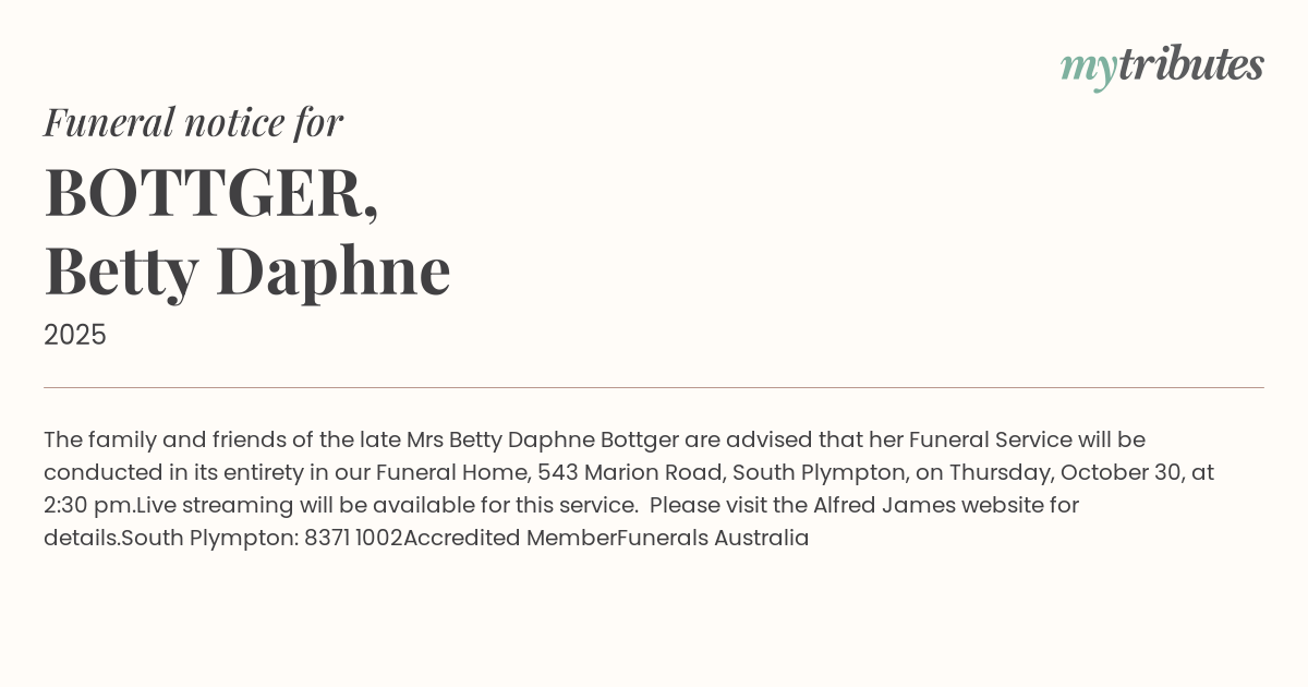 15°CThe family and friends of the late Mrs Betty Daphne Bottger are advised that her Funeral Service will be conducted in its entirety in our Funeral Home, 543 Marion Road, South Plympton, on Thursday, October 30, at 2:30 pm.