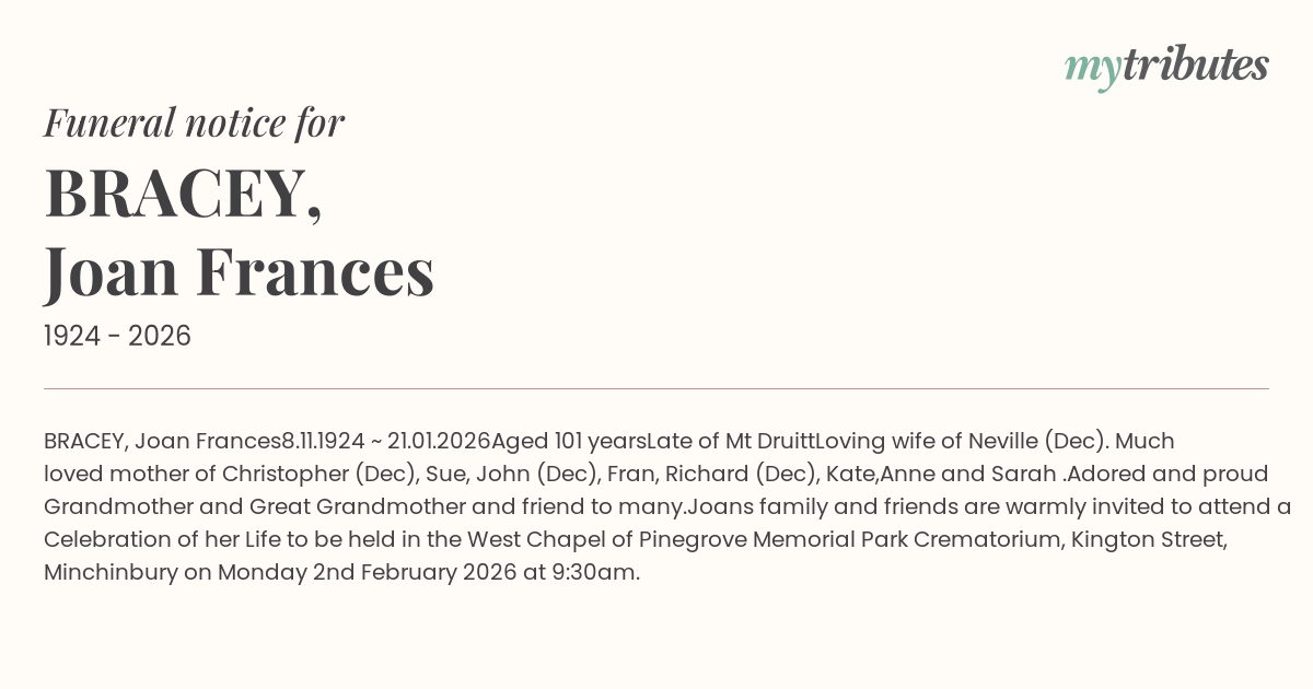 Joan’s family and friends are warmly invited to attend a Celebration of her Life to be held in the West Chapel of Pinegrove Memorial Park Crematorium, Kington Street, Minchinbury on Monday 2nd February 2026 at 9:30am.