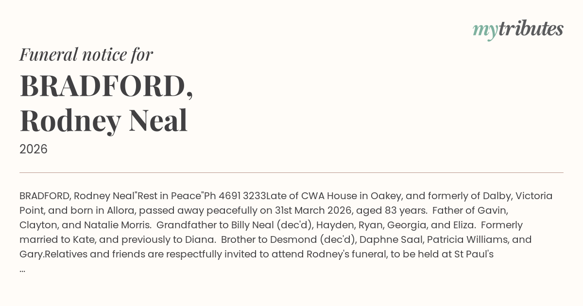 Relatives and friends are respectfully invited to attend Rodney's funeral, to be held at St Paul's Lutheran Church, 9-11 York Street, Oakey, service commencing at 11:00am, Monday, 13th April 2026.