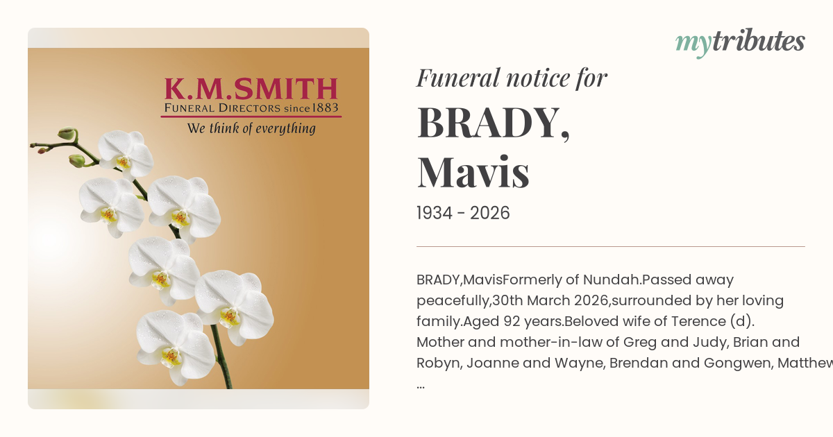 Family and friends are invited to attend a Prayer Service for Mavis, to be held in St. Paschal's Catholic Church, 30 Warraba Avenue, Wavell Heights, on Friday, 10th April, commencing at 1.30 p.m., followed by a private family burial.