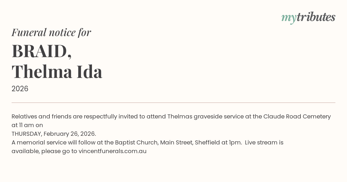 A memorial service will follow at the Baptist Church, Main Street, Sheffield at 1pm. Live stream is available, please go to vincentfunerals.com.au
