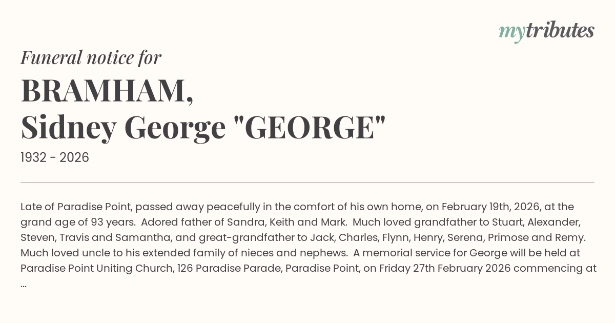 Late of Paradise Point, passed away peacefully in the comfort of his own home, on February 19th, 2026, at the grand age of 93 years. Adored father of Sandra, Keith and Mark. Much loved grandfather to Stuart, Alexander, Steven, Travis and Samantha, and great-grandfather to Jack, Charles, Flynn, Henry, Serena, Primose and Remy. Much loved uncle to his extended family of nieces and nephews. A memorial service for George will be held at Paradise Point Uniting Church, 126 Paradise Parade, Paradise Point, on Friday 27th February 2026 commencing at 1.30pm.