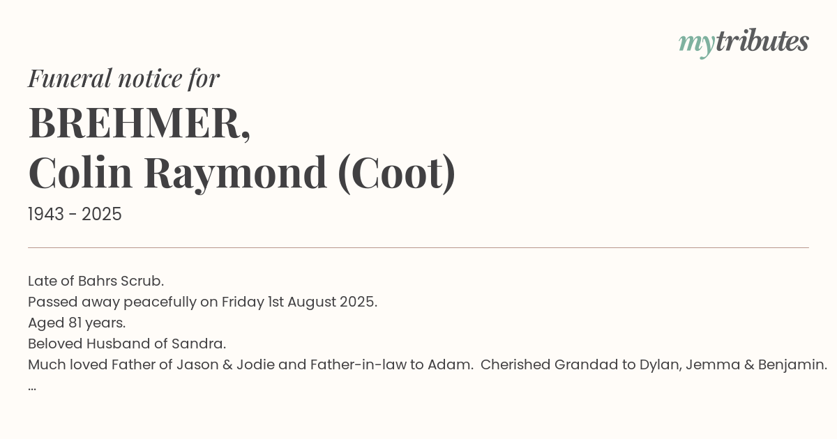 Relatives & Friends of Colin are respectfully invited to attend His Funeral Service to be held at St. Peter's Lutheran Church, 187 Alberton Road, Alberton on Tuesday 12th August 2025 at 10.30am.