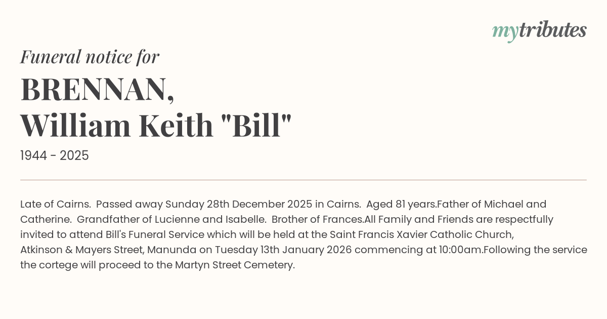 All Family and Friends are respectfully invited to attend Bill's Funeral Service which will be held at the Saint Francis Xavier Catholic Church, Atkinson & Mayers Street, Manunda on Tuesday 13th January 2026 commencing at 10:00am.