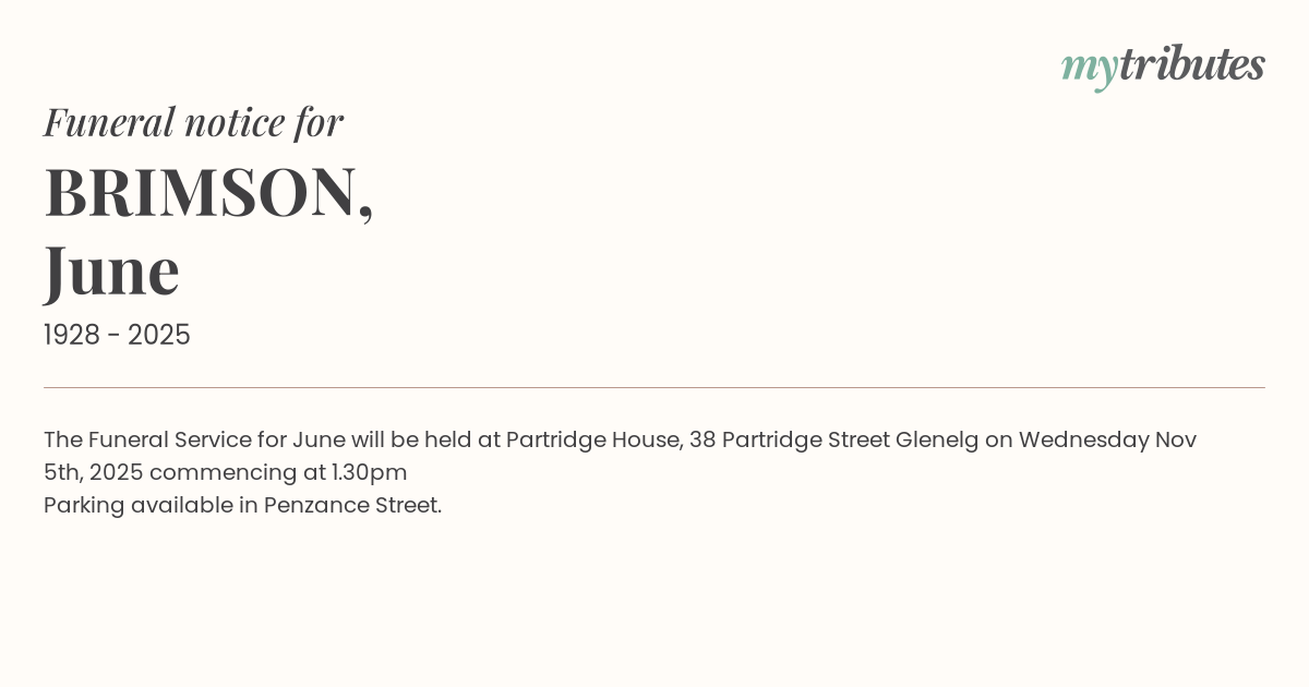 15°CThe Funeral Service for June will be held at Partridge House, 38 Partridge Street Glenelg on Wednesday Nov 5th, 2025 commencing at 1.30pm