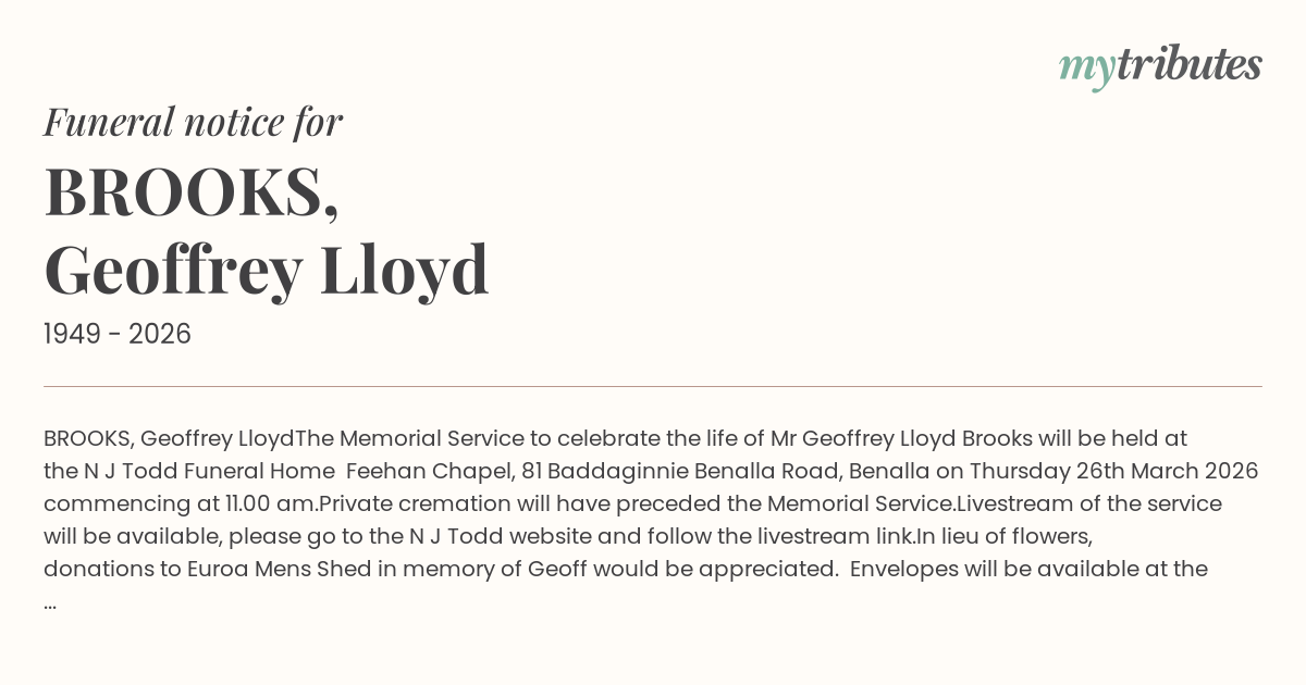 The Memorial Service to celebrate the life of Mr Geoffrey Lloyd Brooks will be held at the N J Todd Funeral Home – ‘Feehan Chapel’, 81 Baddaginnie Benalla Road, Benalla on Thursday 26th March 2026 commencing at 11.00 am.