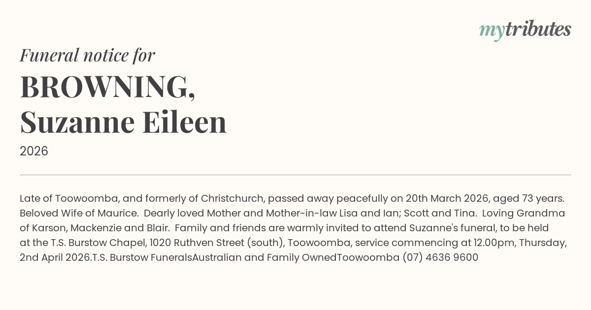 Family and friends are warmly invited to attend Suzanne's funeral, to be held at the T.S. Burstow Chapel, 1020 Ruthven Street (south), Toowoomba, service commencing at 12.00pm, Thursday, 2nd April 2026.