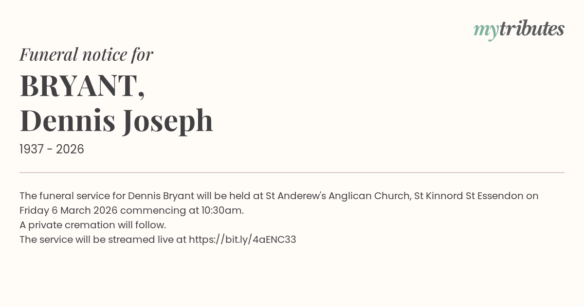 15°CThe funeral service for Dennis Bryant will be held at St Anderew's Anglican Church, St Kinnord St Essendon on Friday 6 March 2026 commencing at 10:30am. A private cremation will follow. The service will be streamed live at https://bit.ly/4aENC33