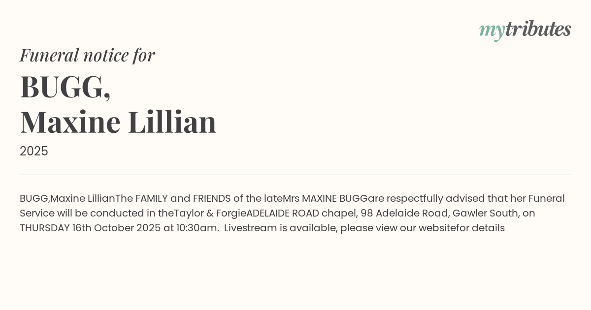 ADELAIDE ROAD chapel, 98 Adelaide Road, Gawler South, on THURSDAY 16th October 2025 at 10:30am.