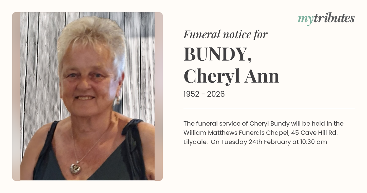 15°CThe funeral service of Cheryl Bundy will be held in the William Matthews Funerals Chapel, 45 Cave Hill Rd. Lilydale. On Tuesday 24th February at 10:30 am