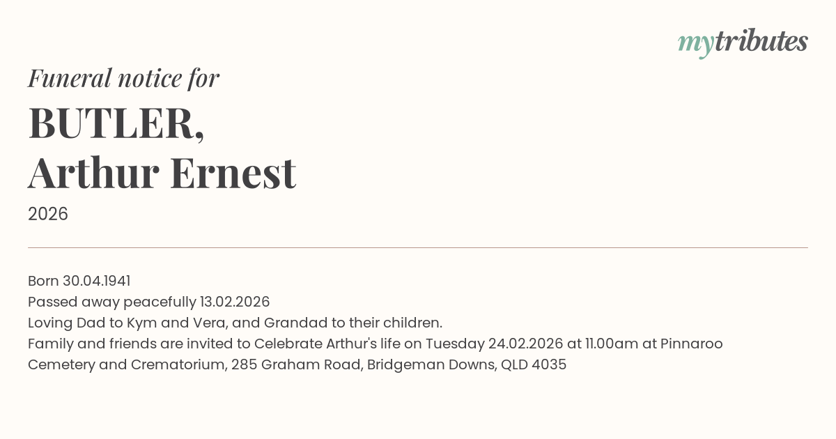 Family and friends are invited to Celebrate Arthur's life on Tuesday 24.02.2026 at 11.00am at Pinnaroo Cemetery and Crematorium, 285 Graham Road, Bridgeman Downs, QLD 4035