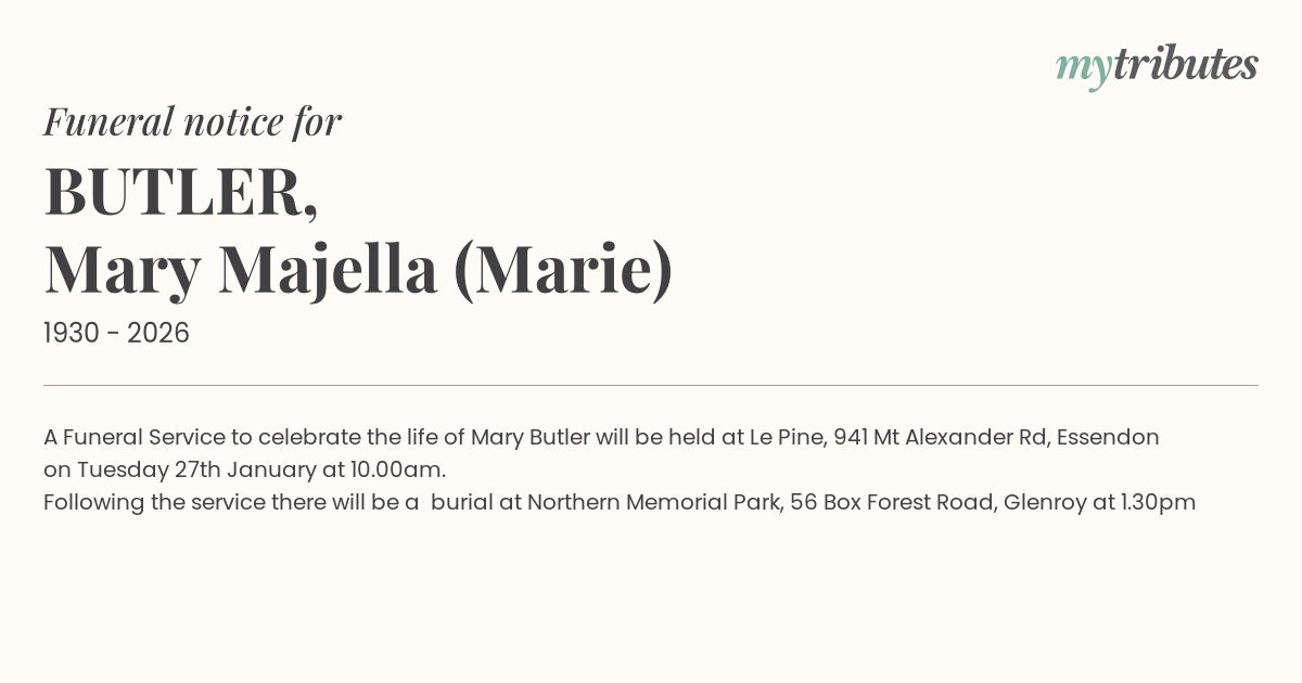15°CA Funeral Service to celebrate the life of Mary Butler will be held at Le Pine, 941 Mt Alexander Rd, Essendon on Tuesday 27th January at 10.00am.