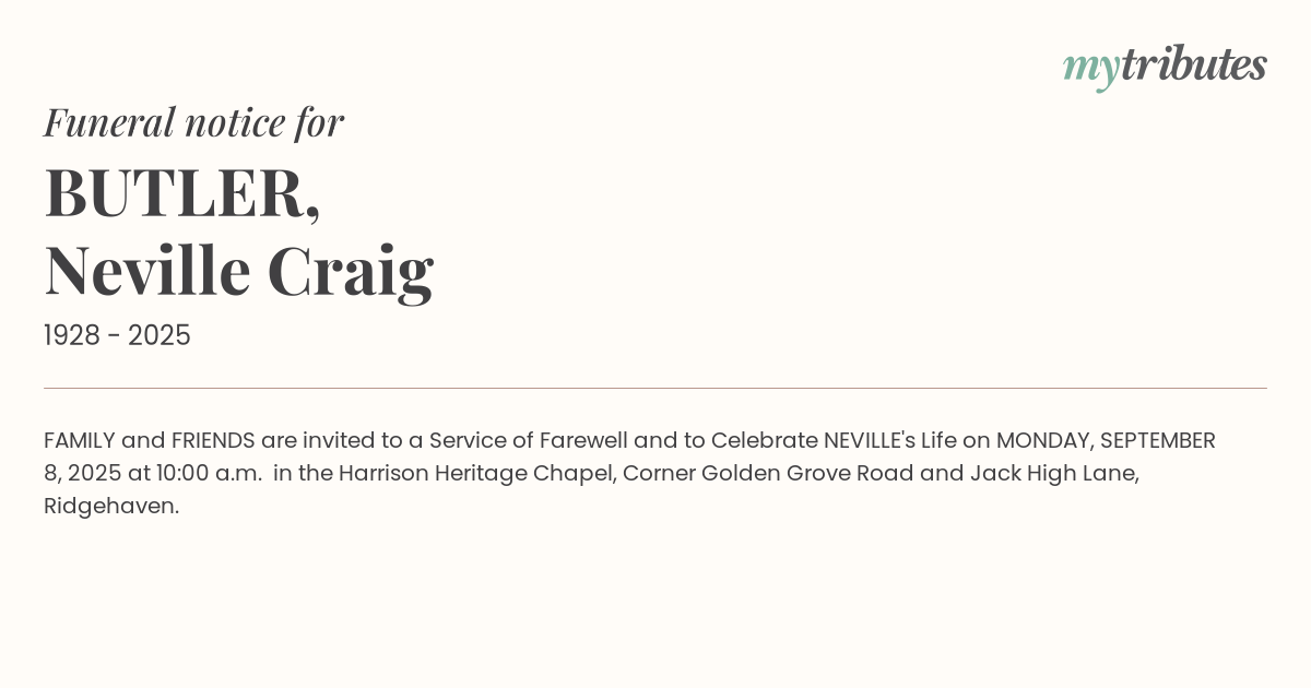 15°CFAMILY and FRIENDS are invited to a Service of Farewell and to Celebrate NEVILLE's Life on MONDAY, SEPTEMBER 8, 2025 at 10:00 a.m. in the Harrison Heritage Chapel, Corner Golden Grove Road and Jack High Lane, Ridgehaven.